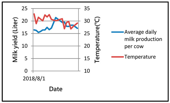 Figure 11 and Figure 12 showed the correlation between temperature and the lactation yield per dairy cow under moderate heat stress status. It was found that the average lactation yield was 16.4354 L/day under the average temperature of 30.9856 °C during 1 to 11 August. Furthermore, the average lactation yield was 18.1641 L/day under the average temperature of 28.3183 °C during rainy days from 16 to 21 August. It indicated that the average lactation yield per dairy cow tended to decrease as the temperature increased under moderate heat stress status. There was a 0.6481 L/day reduction of average lactation yield per dairy cow as the temperature increased about 1 °C.