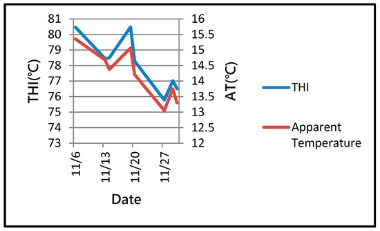 In addition, the apparent temperature index (AT) of the dairy cows was established based on the formula (2) [28], where T was Celsius temperature (°C), RH is humidity, I was illuminance, e is vapor pressure and V was wind speed (m/s). We compared the apparent temperature index (AT) and the temperature-humidity index (THI), and analyzed the difference between the temperature-humidity index (THI) and lactation yields for dairy cows.
