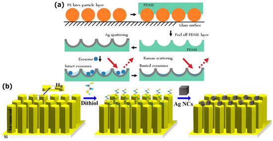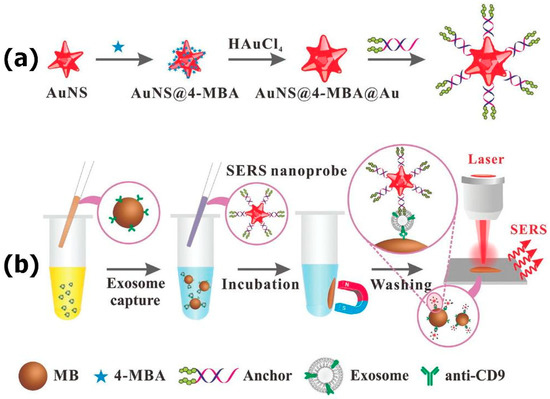 Mechanisms of (a) AuNS@4-MBA@Au SERS nanoprobe fabrication; (b) exosome detection. Reproduced with permission from [105], The Royal Society of Chemistry, 2018.