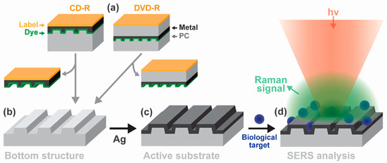 A structured polycarbonate substrate from regular recordable disks (CD-R and DVD-R) coated with silver was used as a cost-effective platform for label-free SERS exosome analysis [101]. The substrate fabrication process is shown in Figure 5. The Raman fingerprints of hemoglobin and exosomes and the impact of the silver thickness, the polycarbonate nanostructure, and the excitation wavelength on Raman enhancement were investigated. The results demonstrated the feasibility of the proposed approach for the analysis of complex biomolecular targets. Another potential application is a Raman scanner based on optical disk drives.