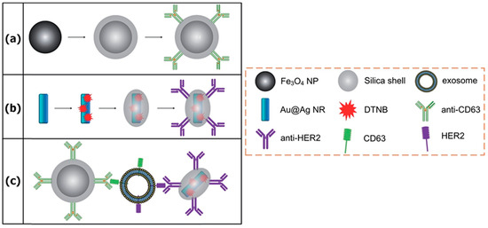A sandwich-type immunocomplex containing/based on antibody-labeled magnetic beads and AuNR has been shown to be an effective approach for the detection of tumor-derived exosomes [103]. Two types of antibodies, anti-CD63 and anti-HER2, were used to recognize two corresponding proteins on the surface of exosomes. The sandwich-type immunocomplex was formed by mixing of AuNR, targeted exosomes, and magnetic beads, as shown in Figure 7. The immunocomplex was then precipitated by а magnet and SERS signals detected in the pellet using 5,5’-Dithiobis(2-nitrobenzoic acid)-labeled AuNR. By using this approach, the authors examined the exosomes derived from human breast cancer cells (SKBR3) and compared them to exosomes isolated from normal human embryonic lung fibroblasts (MRC5). The authors tested the different number of exosomes and found that the proposed approach provides a limit of detection of approximately 1200 exosomes. In addition, the presented method is relatively fast with an operation period/analysis time of 2 h and can be used without the purification of exosomes—for example, by using the cell culture media.