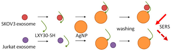 The selective targeting of exosomes derived from ovarian cancer SKOV3 cells by using an α3ß1 integrin-specific peptide conjugated to silver nanoparticles (AgNP) for SERS-based detection and analysis was demonstrated by Chan’s group [104]. The peculiarity of this approach is demonstrated in Figure 8. The LXY30 peptide binds first to the α3β1 integrin on the SKOV3 exosomes followed by the addition of AgNP enabling formation of the exosome–Ag complex via thiol binding. The successful binding of the exosomes to AgNP was verified by the appearance of several distinct SERS peaks that can be assigned to SKOV3 exosomes. The absence of these peaks in the SERS spectra for AgNP-LXY30-Jurkat-derived exosomes confirmed the efficiency/specificity of the proposed method.