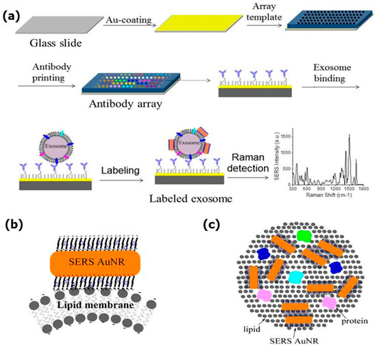 Kwizera et al. used a 3D-printed array template and AuNR to implement a simple, cheap, highly efficient, and miniaturized array device. It captures exosomes in a target-specific manner on the antibody array template situated on standard glass microscopy slides coated with silver. Figure 11a demonstrates the measurement sequence: First, the antibody array preparation; then, labeling the captured exosomes by AuNR; and finally, exosome detection. SERS nanotags represent AuNR with the QSY21 Raman reporter incorporated in the cetyltrimethylammonium bromide (CTAB) bilayer. AuNRs attach to exosome lipid membranes due to their opposite charges. Their interaction with the exosome lipid membrane is illustrated in Figure 11b,c. Protein profiling (CD9, CD44, CD 63, EGFR, CD81, EpCAM, HER2, IGF1R) of cancerous and non-cancerous exosomes (derived from breast cancer MM231, MM468, SKBR3, and normal MCF12A cells) demonstrated that exosomes from different cell lines are related to different surface marker profiles. Proteins CD9, CD63, CD81 are present in all considered cell lines. Within breast cancer patients’ serum assays, CD44 was not able to distinguish probes from cancer patients and controls, while EpCAM and HER2 succeeded in this task. Thus, the device provides a quantitative detection of the target proteins and this process has no significant nonspecific interference. The productivity is 80 purified samples per 2 h. The developed method is meant for initially isolated exosomes, but in future it is proposed to allow direct exosome detection in plasma [107].