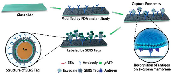 A high-sensitivity approach for early diagnosis, classification, and metastasis monitoring of pancreatic cancer was developed by Li et al. [108] by using a sandwich structure formed by a polydopamine (PDA)-modified immunocapture substrate, exosomes, and polydopamine-encapsulated antibody-reporter-Ag(shell)-Au(core) multilayer (PEARL) nanotags, as illustrated in Figure 12. Due to a self-polymerizing porous hydrophilic PDA layer, specific antibodies are simultaneously encapsulated and captured by the surface. PDA encapsulation provides higher antibody capture efficiency and exosome detection sensitivity compared with other antibody capture methods. A PEARL tag consists of AuNP as a core, a silver shell, 4-aminobenzenethiol (pATP) as a Raman reporter, BSA, PDA, and antibodies. The intensity of the pATP Raman peak at 1072 cm−1 was chosen as a quantitative signal, because it is one of the strongest peaks in immunoassays’ SERS spectra and is not influenced by any impure surrounding peaks. An optimal low PDA layer thickness in PEARL provides stability and high Raman intensity of the nanotag. Comparing the intensities of anti-CD9, anti-CD63, anti-GPC1, and anti-MIF groups for exosomes derived from cancerous and healthy pancreatic cells revealed that anti-MIF and anti-GPC1 platforms can distinguish between them. The developed immunoassay provides an extra-low detection limit of one exosome in a 2 μL sample. Validation of the immunosensor in diluted clinical serum samples from pancreatic cancer patients proved its capability to discriminate between cancer patients and healthy controls as well as between different cancer stages (the latter can be provided merely by anti-MIF).