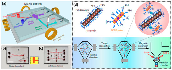 A magnetic nanochain integrated microfluidic biochip: (a) A design of the platform; (b) a top view for a single channel platform; and (c) a multichannel array; (d) structures of a magnetic nanochain, a SERS probe, and detection algorithm. Reproduced with permission from [89], Licensed under CC BY-NC 4.0, 2018.