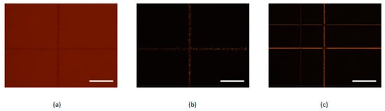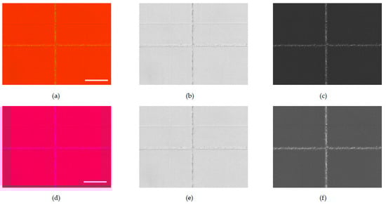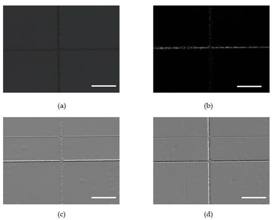 Figure 1a–c respectively shows a bright-field image, a dark-field image, and a phase-contrast image. Refractive index change was barely apparent. However, scattering damage was observed in a bright field image. In contrast, the dark field image revealed microcracks and nonrefractive structural defects of the modification tracks. In this way, the combinational bright field images and dark field images are a promising assessment tool for identifying promising structural modifications in glass. The phase-contrast image enhanced the image contrast of the refractive index change region.