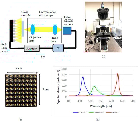 A conceptual diagram of the LED array microscope is presented in Figure 2a. The microscope consists of a part of an upright microscope (BX43; Olympus Corp.). A condenser lens was removed, and an LED array was placed [20]. An RGB full-color dot matrix LED array (8 × 8 dots, NeoPixel NeoMatrix 64 RGBW LED; Adafruit Industries) was placed 35 mm below the sample. The images were captured using a CMOS camera (DFK23UM021; The Imaging Source) through a 10× objective lens with NA of 0.3 (UPlanFLN 10×; Olympus Corp.). The illumination pattern of the LED array was controlled by Arduino. Figure 2b portrays a picture of a constructed LED array microscope. Figure 2c presents an image of the LED array. The LED matrix array size was 7 cm × 7 cm. The pitch between the LEDs was 4 mm. Figure 2d presents spectra of a blue LED, a green LED, and a red LED. The axial resolution was 1.3 μm from the Rayleigh resolution limit, 0.61 λ/NA, where λ is the wavelength of a red LED and NA is the numerical aperture of the objective lens (0.3). The lateral resolution was 4.3 μm from 0.61 λ/NA2.
