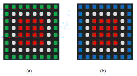 Rheinberg illumination patterns in the LED array. (a) A Rheinberg illumination pattern. Outer LED array (green LEDs) acts as dark-field illumination. The central LED array (red LEDs) acts as bright field illumination. (b) A Rheinberg illumination pattern. The outer LED array (blue LEDs) acts as dark-field illumination. The central LED array (red LEDs) acts as bright field illumination.
