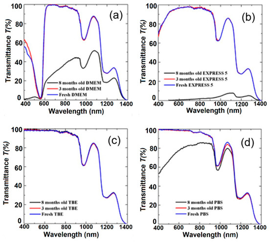 Figure 4c), we did not observe any change in transmission. This buffer was stable during the 8-month-long storage. High stability is related to the composition of TBE, which contains TRIS, boric acid, and EDTA, offering slightly alkaline pH conditions. Moreover, the presence of EDTA is very important due to its chelator activity, particularly for magnesium ions (Mg
