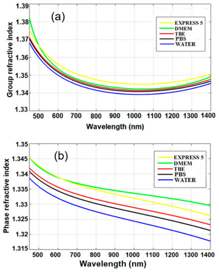 Group and phase refractive indices of water and the other investigated liquids were calculated according to Equation (1) and using interferograms, as shown in