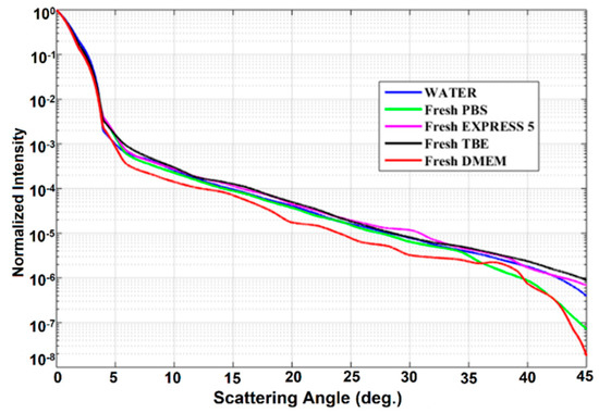 Figure 6). Also, the scattering properties of water are shown here for reference. We observed that normalized intensity decreased exponentially with the angle. For an angle higher than 45°, scattering intensity dropped nearly to zero. The obtained characteristics of fresh samples were very similar to those of water. It seems that the biochemical nutrients present in the CCM do not induce any additional scattering with respect to that of water, mostly due to the fact that their size is much smaller than the wavelength of the laser source.