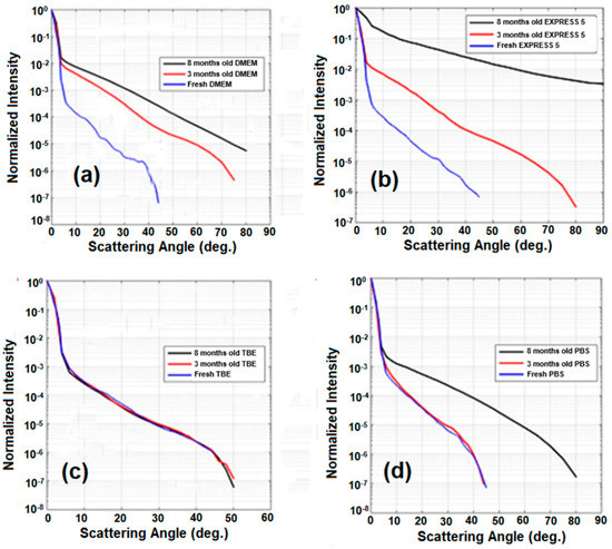 Figure 7). For DMEM, EXPRESS 5, and PBS, we observed a significant increase of scattering. Only in the case of TBE did scattering remain unchanged. These results agree with the measurements of the transmission of the liquids, where DMEM, EXPRESS 5, and PBS changed in time, while TBE remained unchanged. This behavior is related to the presence of substances enabling microorganism growth (such as nutrients and simple salts) in DMEM and EXPRESS 5, or salt crystallization in the case of PBS. Moreover, in CCM, after longer storage, the nutrients decomposed due to their limited half-life, causing media degradation. The stability of TBE was significantly higher due to the EDTA chelating properties and its slightly alkaline pH.
