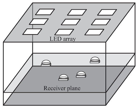 The room model. The room size was 7.5 m × 7.5 m × 3 m. The height of the receiver was 0.7 m from the floor. The height of LED arrays was 3 m from the floor [16].