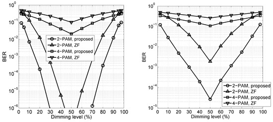 Figure 4 illustrates the bit error rate (BER) of the proposed TPC scheme using PAM at different dimming levels, in which the BER of the traditional pseudo-inverse based ZF TPC from RF is also provided for comparison [24]. Observe in Figure 4 that for both scenarios, the proposed TPC achieved a significant BER performance gain compared to the ZF TPC. The BER performance became better when the dimming level tended towards , since the linear dynamic range of LED can be fully exploited in this case. Additionally, the BER performance for Scenario 1 with six users was better than Scenario 2 with eight users, implying that the BER performance of the dimming compatible VLC system degraded when supporting more users. From Figure 4, we also observe that the performance of the multiuser VLC system degraded with the increasing PAM modulation order.
