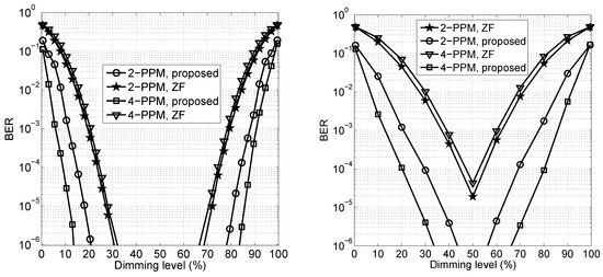 In Figure 5, we portray the BER of the multiuser VLC system employing 2-PPM and 4-PPM, which both have the non-zero mean. It can be observed from Figure 5 that our TPC scheme still achieved much better performance than the ZF TPC for PPM, which verifies the applicability of the proposed scheme to modulations with the non-zero mean. In contrast to PAM, a better performance was achieved when employing the higher-order PPM. This is because as the modulation order increased, the power efficiency of PPM was improved at the cost of its bandwidth efficiency deterioration [25]. Moreover, under relatively low or high dimming levels, the multiuser VLC system employing PAM exhibited a performance loss, while the TPC employing PPM performed well. PPM appeared to be a beneficial design choice to provide a stable communication link at relatively low or high dimming levels despite its low spectrum efficiency compared to PAM.