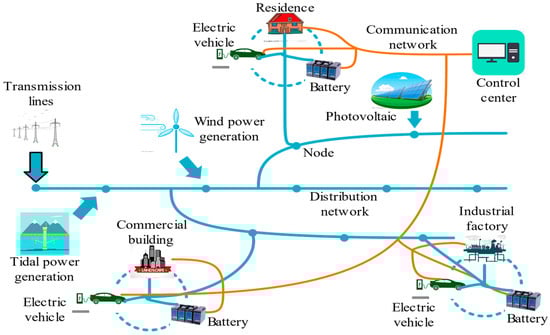 Traditionally, traditional generators’ droop control is a typical method to address the frequency issues in the power system. The droop control uses the real power output of a generator to calculate the ideal operating frequency. This relaxing of a stiff frequency allows the grid to dampen the fast effects of changing loads, increasing the stability of the system []. However, traditional generators may be phased out in the future due to the constraint of the greenhouse gas emissions on a global scale, making the traditional generators insufficient to deal with the increasing requirements of frequency regulation []. The change of the load’s operating power can provide frequency regulation service when the system frequency fluctuates []. Moreover, the operating power of the Demand-side resource can be regulated rapidly, while the generator regulates its power generation through a series of processes, such as the speed governor process and the reheat steam turbine process, leading to a larger inertia compared with Demand-side resource []. In terms of voltage, different types of regulators are used to maintain the voltage within an acceptable range in traditional distribution systems, such as, on-load tap changer (OLTC), step voltage regulators (SVRs), and shunt capacitors (SCs) [,,,,,]. The tap operation of an OLTC and an SVR can directly regulate the distribution system voltage from the system operator []. SCs can solve a series of problems caused by electrical loads’ reactive power consumption, which can improve the voltage profile and reduce system losses. However, when the penetration of grid-integrated DGs is getting large, those types of regulators are not efficient enough to regulate the voltage in the fast nonlinear dynamics []. Moreover, frequent switching operation will reduce regulating efficiency. PV inverters can inject or absorb reactive power, in order to mitigate the overvoltage problems []. In addition, it is necessary to splits distribution networks into several separate control areas to control the voltage profile of each area in an admissible time calculation for online operation []. Because the resistance/reactance (R/X) ratio is relatively large in a low-voltage distribution system, the effectiveness of reactive power in voltage control is limited. As a result, active power adjustment should be considered for the voltage control of distribution systems. In addition, demand response is an effective way to keep the voltage in a permissible range []. Demand response changes consumers’ inherent power consumption mode, reduce or shift the power load for a certain period of time, thus ensuring the stability of the power grid.