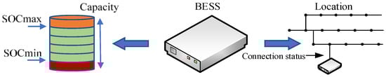In the structure, control center collects status information of BESSs through the communication network. To achieve the coordinated control of the BESSs, it is necessary to know the energy storage status. As show in Figure 2, status information includes the upper limit state of charge (), the lower limit state of charge (), the location information, the capacity of the energy storage device, and the connection status.