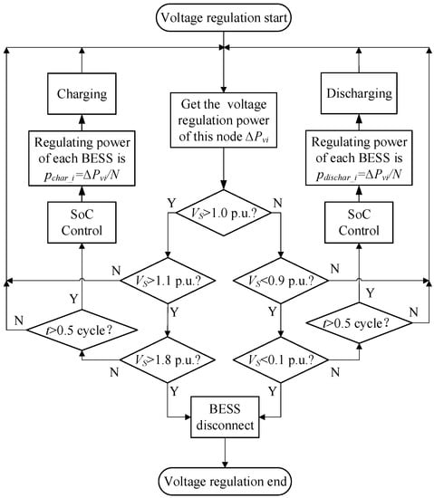 Step 2: In order to prevent the BESSs suffering damage while grid voltage being too high or too low, it is necessary to perform grid voltage detection. If the voltage is between 0.1 and 0.9 p.u., the BESS is ready to be discharged. On the other hand, if the voltage is between 1.1 and 1.8 p.u., the BESS is ready to be charged. When the magnitude of the voltage is less than 0.1 p.u or greater than 1.8 p.u., the BESS is disconnected from the system [,].