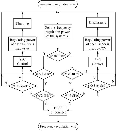 Therefore, we propose a novel control algorithm for coordinated control of BESSs, which enable power systems to deal with emergencies and combines voltage regulation and frequency regulation in one process by using the operating reserve. Through the coordinated charging and discharging of multiple BESSs, the grid voltage and frequency are controlled within the permissible range, and the adverse effects caused by deviation are alleviated. BESSs’ adjusting speed is outstanding, it can reach the required power within the time set by the Union for the Coordination of Transmission of Electricity in Europe (30s) []. The number of charging and discharging cycles of BESSs is minimized to save the life time. The contributions of this study are as follows: