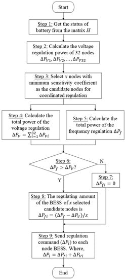Figure 6 shows the overall flow chat of the BESS coordinated control algorithm proposed in this paper, which is mainly composed of four parts: (1) The full-time SOC control, it is used to confirm the situation of the BESSs, which includes the quantity of power-adjustable batteries, charging/discharging power of batteries and the SOC of each battery. The information will be used for the selection of BESSs. (2) The independent voltage regulation algorithm, it is used to calculate the power required for voltage regulation of each node at the current time. The sum of the power adjustments of each node is calculated at the end of this step. (3) The independent frequency regulation algorithm, it calculates the required power for the entire distribution frequency regulation. (4) The coordinated voltage and frequency regulation algorithm, it compares the frequency regulating power of the distribution network and the sum of each node’s voltage regulating power. If voltage regulating power is larger than the frequency regulating power, the voltage regulating power will be the final regulation power. If frequency regulating power is larger than the voltage regulating power, the frequency regulating power will be the final regulation power. The larger part of the power will be allocated to the nodes with lower sensitivity coefficient according to Section 3.4.