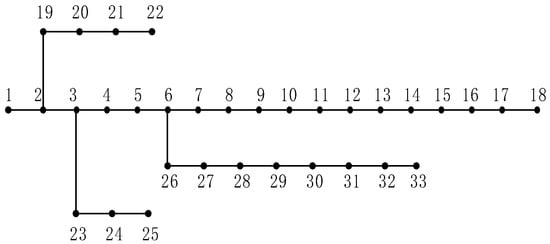 IEEE 33-node power distribution system is applied to verify the proposed coordinated control algorithm (as shown in Figure 7) []. Node 1 is the reference node and the voltage is fixed at 1 p.u. The other 32 nodes are user nodes, and the allowed range of each node voltage is [0.9, 1.1] p.u. The test data are based on the generated power of PV and the load in Ota city, on June 1st, 2007 []. The simulation is carried out during one day, 24 h period is divided equally into 2880 slots, i.e., each slot is 30s.
