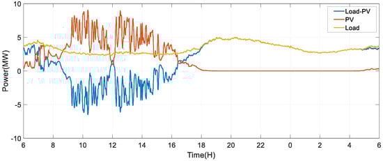 We assume 100 users in a node, and each user is equipped with a photovoltaic (PV) system. In this paper, the daily load data and PV generation data are referenced in the literature [], which are showed in Figure 9. The PV output is large during the period of 9:15–11:40 and 12:15–15:10. The peak power is 9032 kW. Daily load curve fluctuates between 2306 kW and 4994 kW.