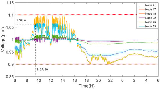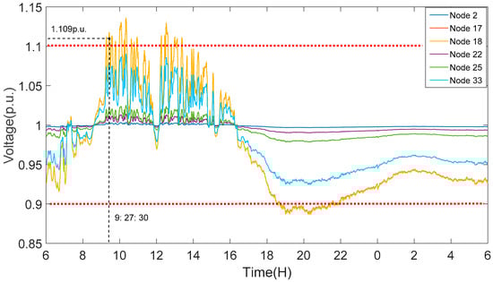 According to the voltage sensitivity coefficient, nodes number of 1–4 and 19–25 have small sensitivity coefficient and therefore voltage deviation is small in these nodes. It is can be seen from Figure 11 that during the period of 9:15–11:00 and 12:30–13:10, the grid is in an overvoltage state because of the large output of PV generation and low load consumption. During the time of 18:30–22:00, the grid is in an undervoltage state. The peak and valley of voltage are 1.13573 and 0.88816 p.u., respectively.