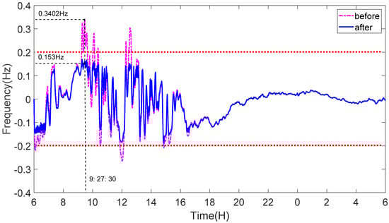 Figure 12 shows the power system frequency deviation curve regulated by the proposed algorithm. Dashed and solid curves indicate the frequency before and after regulation, respectively. During the period of 6:40–7:05 and 11:45–12:15 frequency exceeds the lower limit, 9:35–10:30 and 12:10–12:45 frequency exceeds the upper limit. Actually, the net load (load-PV) that, shown in Figure 9, is in a high load state during 6:40–7:05 and 11:45–12:15, and in a low load state during the period of 9:35–10:30 and 12:10–12:45. In addition, the fluctuation of PV is intense during this period, the frequency fluctuation is consistent with the trend of the daily net load curve. After the regulation, the frequency of the power distribution system is within the normal range.