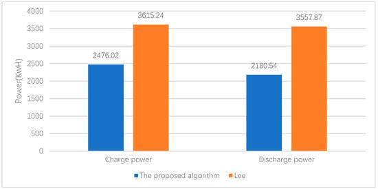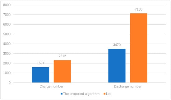 The proposed coordinated control algorithm is compared with Lee algorithm []. Figure 13 shows the total number of BESSs charging and discharging cycles, and Figure 14 shows the total BESS charging and discharging power. The number of charging cycles of Lee algorithm is 2312 and the number of discharges cycles is 7130. The number of charging and discharging cycles of proposed algorithm is 1597 and 3470, respectively. The number of charging cycles is reduced by 30.86% and the number of discharging cycles is reduced by 51.33%. As shown in Figure 14, the total charging power of the Lee algorithm is 3615.24 kWh and the discharge power is 3557.87 kWh. The charging power of the proposed algorithm is 2476.02 kWh, which is reduced by 31.51% compared to the LEE algorithm. The discharge power of the proposed algorithm is 3557.87 kWh, which is reduced by 38.71%.