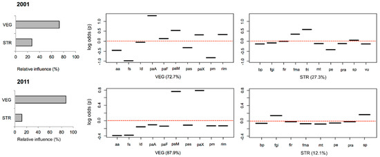 | Habitat structure (development stage) (STR) | (1) two-layered stand (bp); (2) adult stand (fad); (3) late pole stand (fgi); (4) irregular stand (fir); (5) mature stand (fma); (6) over-mature stand (fri); (7) multi-layered stand (mt); (8) young pole stand (pe); (9) wooded pasture (pra); (10) thicket stand (sp); (11) gap (vu) |