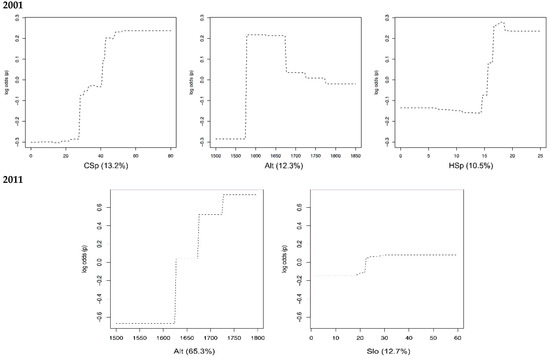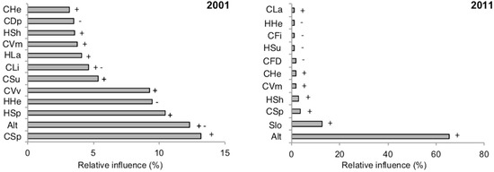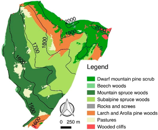 | Habitat type (canopy composition) (VEG) | (1) silver fir (aa); (2) beech (fs); (3) larch (ld); (4) spruce and fir (paA); (5) spruce and beech (paF); (6) spruce on moist soil (paM); (7) spruce on dry soil (paX); (8) pasture (pas); (9) mountain pine (pm); (10) tree plantation (rim) |