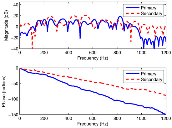 Frequency responses of the primary path and secondary path for a real duct ANC system.