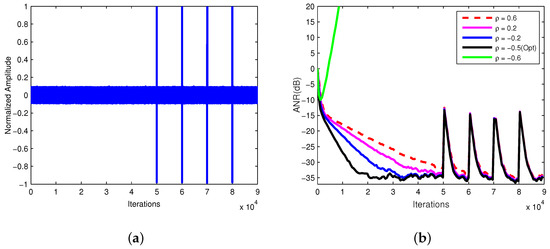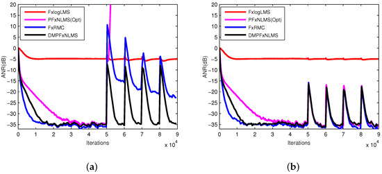 To provide a fair comparison of these algorithms, the step size was selected as for NLMS based algorithms, so that they have a similar ANR results in Gaussian noise environment. According to [13], the parameter () of PFxNLMS needed to be set manually to fit different environments, and its optimal value was selected by simulations as shown in Figure 4. According to Figure 4b, the optimal value of PFxNLMS was . Thus, PFxNLMS(Opt) with was used to represent the PFxNLMS in the following simulations.