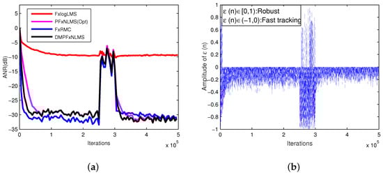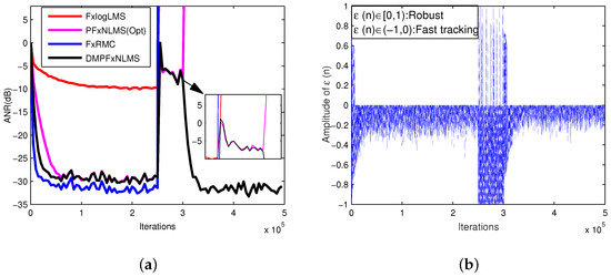 In Figure 5a, PFxNLMS(Opt) diverges at about iterations. The FxRMC has the best initiate tracking ability, when impulsive interference is strong enough (), it diverges at about iterations. The FxlogLMS performs worse on noise reduction level, and it cannot keep steady when interference occurs. The proposed DMPFxNLMS had a lower computational load than FxRMC, and it had similar initial tracking performance and better robust performance when strong interference happened. In Figure 5b, it is noted that in the iterations between and , DMPFxNLMS works in robust state, which shows the reason of that DMPFxNLMS dose not diverge at the iterations like the PFxNLMS(Opt).