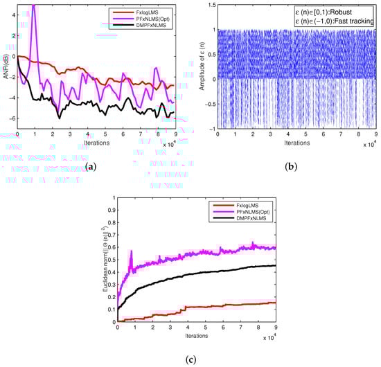 The changed with different noise environments. To make comments of the proposed DMPFxNLMS completely, the Gaussian noise () field and the variable- environment should also be considered. According to this idea, as shown in Figure 5, in the noise interference environment where and , the M-estimation method based FxlogLMS, the PFxNLMS(Opt) and FxRMC were used to compare with DMPFxNLMS. The impulsive interferences began at the -th iteration and end with the -iteration. The changing process of is also shown to give further information to understand DMPFxNLMS.