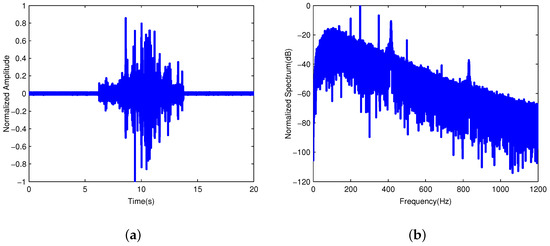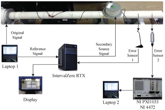 In real-time experiments, the FxLMS, FxlogLMS, PFxNLMS, and DMPFxNLMS were applied to Intervalzero RTX 64 real-time system, respectively. The standard FxLMS was introduced to evaluate the performance of the proposed DMPFxNLMS. The FxRMC was deprived in the real-time experiments due to its heavy computational load [21,22,23,24]. The estimated secondary path using off-line LMS algorithm was modelled as a FIR filter with 16 orders [25]. The sampling frequency was 8000 Hz. The length of weight vector was 32 taps. The diagram of the real-time experiment is shown in Figure 9. Figure 10a,b show the analysis of the record sound in the time domain and frequency domain, respectively.