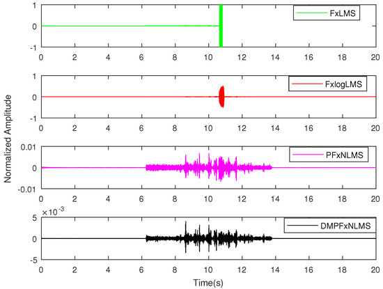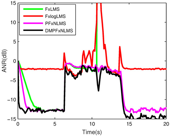The error learning curves are shown in Figure 11. The FxLMS nearly diverged at 11 s, thus it was stopped manually after that time. It shows that DMPFxNLMS had better attenuation performance than FxlogLMS and PFxNLMS. To show clearly, the ANR performance was considered to give further results in Figure 12.