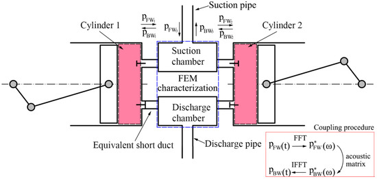 As stated before, the hybrid model consists of the compressor, gas dynamic and acoustic FEM characterization sub-models. The former two sub-models work in the time domain, whereas the last one is in frequency domain. Reciprocal interaction among sub-models is determined by the coupling algorithm, as shown in Figure 3. Moreover, in order to guarantee the implementation of this method, the compressor suction/discharge valve channels are approximately treated as equivalent short ducts (ESDs). The numerical procedure is inspired by the points that the in-pipe pressure perturbation in the way of 1D unsteady flow may be decomposed as a forward pressure component and a backward pressure component [24]: