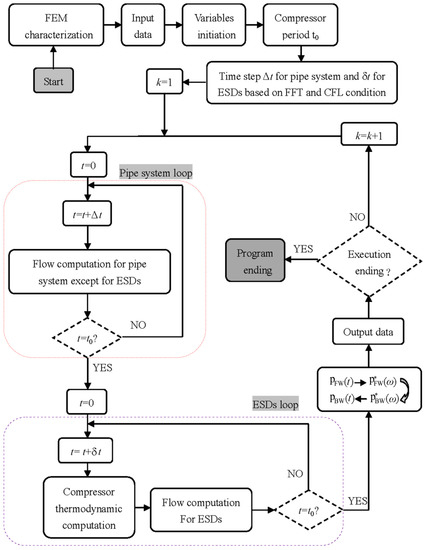 The flowchart of the hybrid approach is shown in Figure 4. The acoustic FEM simulations of complex geometries are first performed based on the approach described in Section 2.3. The obtained acoustic coefficients are then introduced in main procedure. The time steps are determined based on FFT and CFL condition. The flow computation for main pipes are carried out based on the approach described in Section 2.2 for one whole cycle, and then the compressor thermodynamic calculation (Section 2.1) and flow calculation in ESDs are also performed for a whole cycle. Subsequently, the hybrid coupling procedure described in Section 2.4 is carried out. The obtained acoustic boundary will used in next cycle. As coupling of acoustic characterization needs time-domain variables for a necessarily whole period, the numerical procedure follows a period iterative fashion. The procedure includes three loops totally. The pipe system loop is performed to solve the governing equations in the main pipe and the boundary conditions. Subsequently, the ESDs loop is performed with solution of compressor thermodynamics and the unsteady flow in ESDs. The above two loops are included inside a main loop which regulates the well-running of execution. Also, the main loop calculates the values with k + 1 indicating the period-iterative times, which will be imposed in the next period as boundary conditions at the pipe-end connected to the FEM characterized configuration.