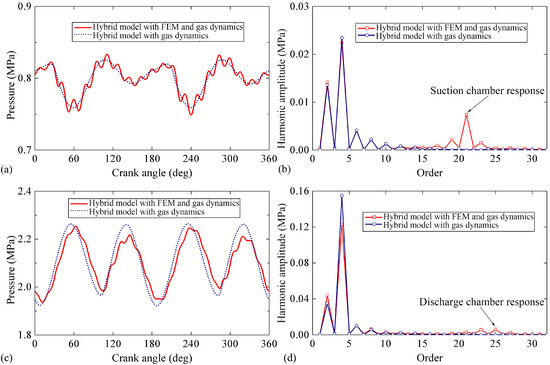 It is worth pointing out that the compressor model with in-pipe 1D gas dynamics has been successfully applied to very simple compression system. A comparison analysis is performed between it and the developed hybrid model with acoustic FEM characterization. Figure 7 shows the comparison of pressure profile and its amplitude-frequency characteristics at the suction and discharge pipe-ends connected to the chamber. Generally, the two models give similar results when an acoustic response is not dominated by chamber. In particular, the attention is focused on the influence of complex geometries on compressor simulation. It can be seen that the model with 1D gas dynamics poorly involves the acoustic response of chamber as it simply considers the chamber as a volume cavity. Conversely, the hybrid model predicts clearly marked acoustic response of the chamber due to the acoustic FEM characterization.