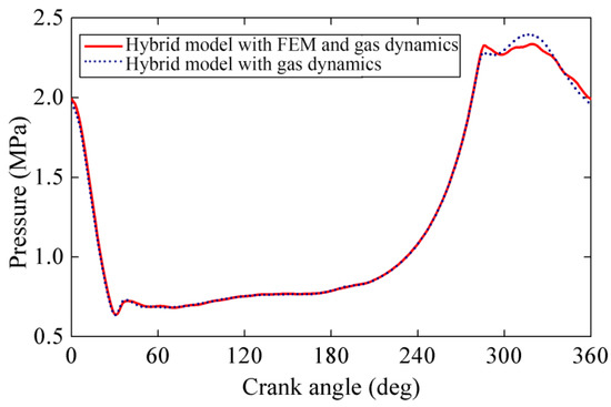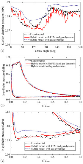 Figure 10a shows the comparison of the suction pressure profiles between the simulation and experiment. Through the figure, it can be highlighted that the new hybrid model demonstrates better agreement with experimental results compared to the hybrid model with gas dynamics. The latter model simplifies the complex chamber as a volume element with neglecting the pressure pulsations at high frequency and underestimating the pulsation amplitude. However, the new model is suitable for describing the high level of chamber details. The in-cylinder pressure variation between simulation and experiment is illustrated in Figure 10b. Generally, both the two models possess the potential of reproducing thermodynamic cycle. However, the new model can describe the trend of the measured in-cylinder pressure oscillation with a better agreement, the details of the suction phase, as shown in Figure 10c.