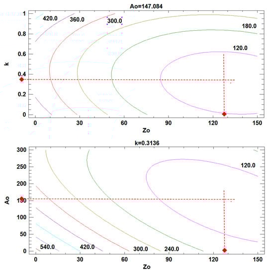 Fundamentally, a simplified version of the optimization approach described in Section 4 is used to determine the optimal values of the control parameters  for Policy-II. In this case, we use a two-factor experimental design for each combination of  and . A regression analysis was used to fit the total expected cost by a quadratic model, using the data of the basic case of Table 1 and Table 2, and the ANOVA for Policy-II reported . Furthermore, the two design factors and their interactions were significant, obtaining the following quadratic function: