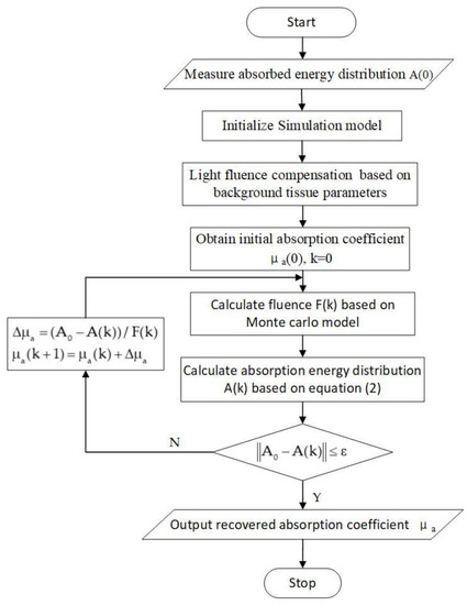 Flow chart for quantitative reconstruction the distribution of optical absorption coefficients.