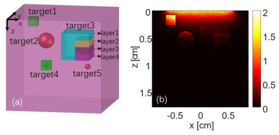 The 3D tissue model contains 5 targets with different absorption coefficients with a range of 0.45 cm−1 to 7 cm−1 embedded in a block tissue (1.8 × 1.8 × 1.8 cm3). Target 1 is a cube with a side length of 0.18 cm, the absorption coefficient is 2.0 cm−1. Target 2 is a sphere (dia. 0.30 cm) with absorption coefficient of 6 cm−1. Target 3 is a multi-layer nested structure, which is a large cube nested into four layers, and the absorption distribution of each layer is 1, 3, 5, 7 (cm−1). Target 4 is a little cube with a little ball inside, the of the inner-sphere is 4 cm−1. Target 5 is a sphere (dia. 0.12 cm), the absorption coefficient is the same as for target 2. The simulation parameters are summarized in Table 1. The background’s absorption coefficient was = 0.45 cm−1, and its scattering coefficient was = 356.5 cm−1.