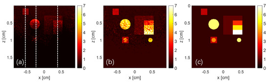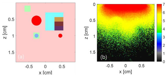 Performances were also evaluated by a tissue-mimicking phantom with an embedded absorber, as illustrated in Figure 7a. The background of the tissue-mimicking phantom with a size of 0.6 (X) × 0.6 (Y) × 0.6(Z) cm3 included (1%–2%) Intralipid and Arga powder. The absorption and scattering coefficients of the base phantom were 0.04 and 200 cm−1 at a wavelength of 532 nm [26,34,43,44]. A 2 mm-diameter tube filled with 5% Indian ink as the absorber was inserted into a phantom-base. The µa value of the Indian ink absorber was 112.5 cm−1, and scattering coefficients was 100 cm−1, we utilized a spectrophotometer to measure the optical properties of the phantom sample, and the absorption coefficient value was normalized to 100 for computational convenience [26,27,34].