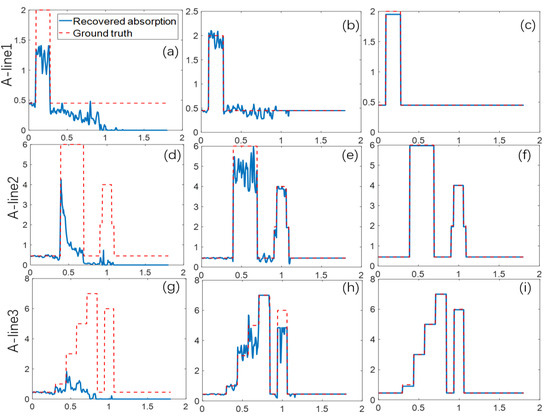 Three A-line profiles were selected to visualize the performance of the proposed quantitative recovery absorption coefficient method, which were the results of three iterations of 1, 5 and 10, respectively corresponding to the absorption distribution in Figure 4. Each row represents the same A-line, each column represents the result of the same iteration. The dotted red line represents the ground truth of absorption coefficient, the solid blue line represents the recovery of the absorption coefficient: (a,d,g) are No.1 iteration results; (b,e,h) are No.5 iteration results; (c,f,i) are No.10 iteration results with normalized. The x-coordinate axis (bottom) illustrate the spatial scale, the unit is cm, the ordinate (left) represents the value of the absorption coefficient, the unit is cm−1.
