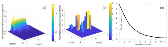 (a) Absorption energy distribution before iteration recovery; (b) Absorption coefficient distribution after iterative recovery; (c) The iteration error.