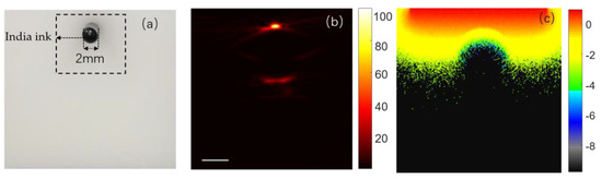 (a) the configuration of phantom; (b) a B-scan of phantom PA signal, the color scale (right) represents the absorbed energy density; (c). A caption on a single line should be centered, the color scale (right) unit is J/cm2. The scale bar (short solid white line) is 1 mm.