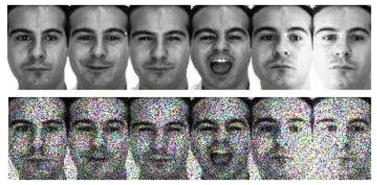 Z 1 can be obtained by adding noise items to the original face image using speckle noise. The specific implementation method is the MATLAB function “imnoise”. Figure 2 shows the comparison of two samples.