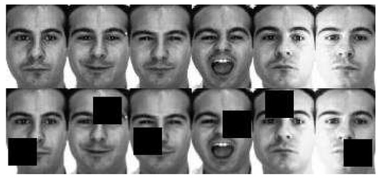 The AR dataset contains over 4000 pictures of 126 objects. Figure 5 shows a diagram of some examples from the AR face database. The dimension of each face image is 165 × 120 . Each person had 26 photographs taken in two separate sessions, except 17 people had fewer than 26 images. Here, the nonoccluded image training set from session 1 and all images of the 17 people are selected for training. There are two cases in the gallery set. One gallery sample is equal to the training samples, which means each theme has multiple samples, and the other gallery set has only one sample per subject, which is a collection of neutral samples for each subject in session 1. The alternative training samples are generated by mirroring, with added noise and random square block occlusion of the original training samples. Finally, all images in session 2 are chosen as the testing samples, the test samples are divided into three subsets: expression, lighting, occlusion. The proposed KRDD method learned from the real occlusion variations in the 17 subjects and the stimulated disturbance from the alternative training samples.